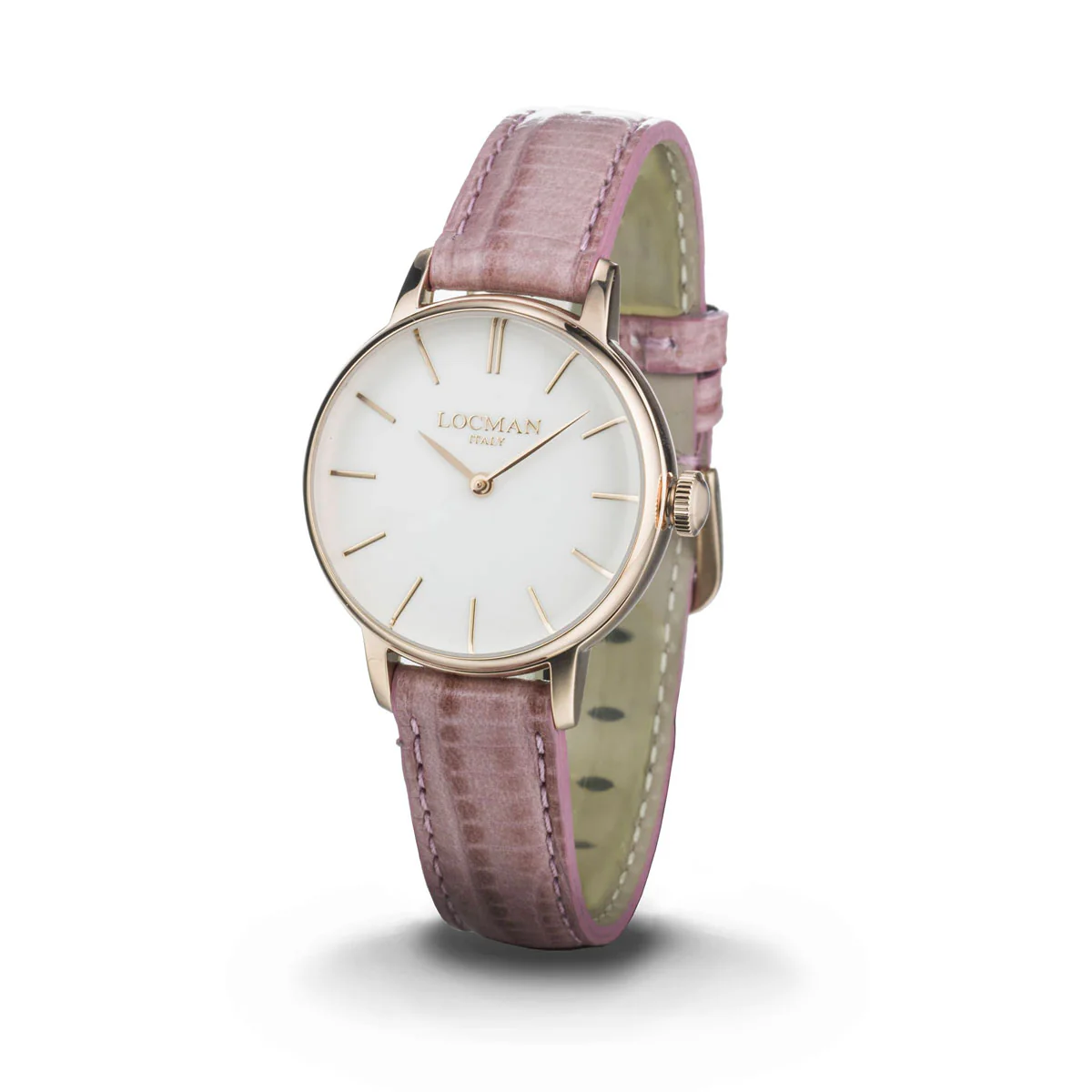 L’orologio Locman 1960 rende omaggio alla creatività, all’energia positiva e al buon gusto del periodo d’oro italiano. La cassa del modello Lady è una cassa da 32MM in acciaio impreziosito da un trattamento in PVD oro rosa e insieme al cinturino in pelle rosa trasferiscono al polso lo stile impeccabile e l’atmosfera spumeggiante di quegli anni. Il quadrante bianco di questo segnatempo da donna ha un design minimalista che viene animato da un movimento al quarzo.