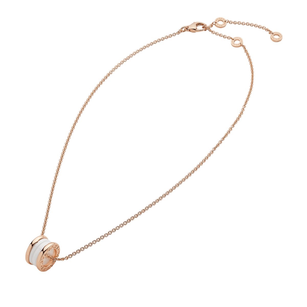 Ispirata all’anfiteatro più famoso al mondo, il Colosseo, la collana B.zero1 è una suprema attestazione del talento creativo di Bulgari. Con la purezza del suo design, che rievoca la magnificenza della Città Eterna, la spirale rappresenta la perfetta armonia tra passato, presente e futuro ed è un emblema dello spirito pionieristico che anima la collezione. Catena con pendente B.zero1 in oro rosa 18 kt e ceramica bianca. Lunghezza 37,6-45 cm.
