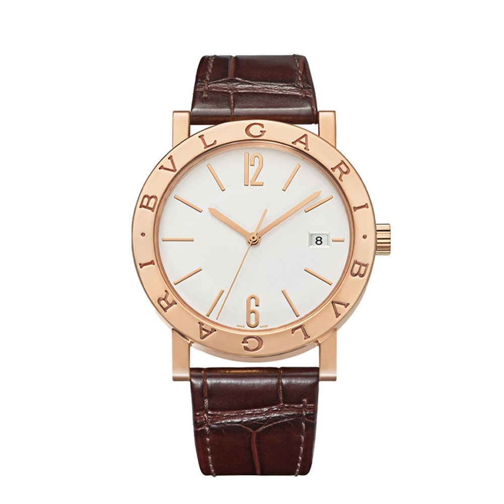 Orologio Bvlgari Bvlgari con movimento meccanico di manifattura a carica automatica, funzioni ore, minuti, secondi e data, calibro BVL 191 (spessore 3,80 mm), frequenza 28.800 VpH (4 Hz) e riserva di carica di 42 ore. Cassa di 38 mm in oro rosa 18 kt, lunetta in oro rosa 18 kt con doppio logo, quadrante opalino bianco, lancette e indici color oro, corona in oro rosa 18 kt, cinturino in alligatore marrone con cuciture e fibbia ad ardiglione in oro rosa 18 kt. Impermeabile fino a 50 metri.