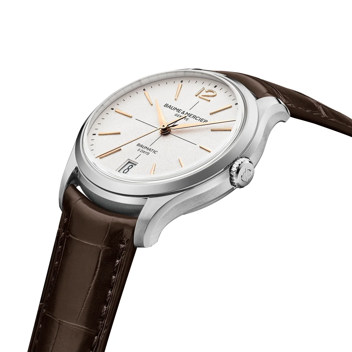 Il Clifton 10773 ha una cassa rotonda in acciaio inossidabile satinato e si aggiunge alla collezione nel formato da 39 mm. La cassa presenta una corona in acciaio e un fondello aperto in zaffiro. Il sottile quadrante bianco con finitura granulata, orlato da una minuteria e da un mirino neri, mette in evidenza il numero arabo a ore 12, gli indici dorati e sfaccettati rivettati a forma di trapezio e le lancette a forma di alfa. È dotato di un movimento Baumatic a carica automatica con riserva di carica di 5 giorni e impermeabilità fino a 5 ATM. Il cinturino intercambiabile in alligatore marrone è dotato di un affidabile sistema di sostituzione senza attrezzi.