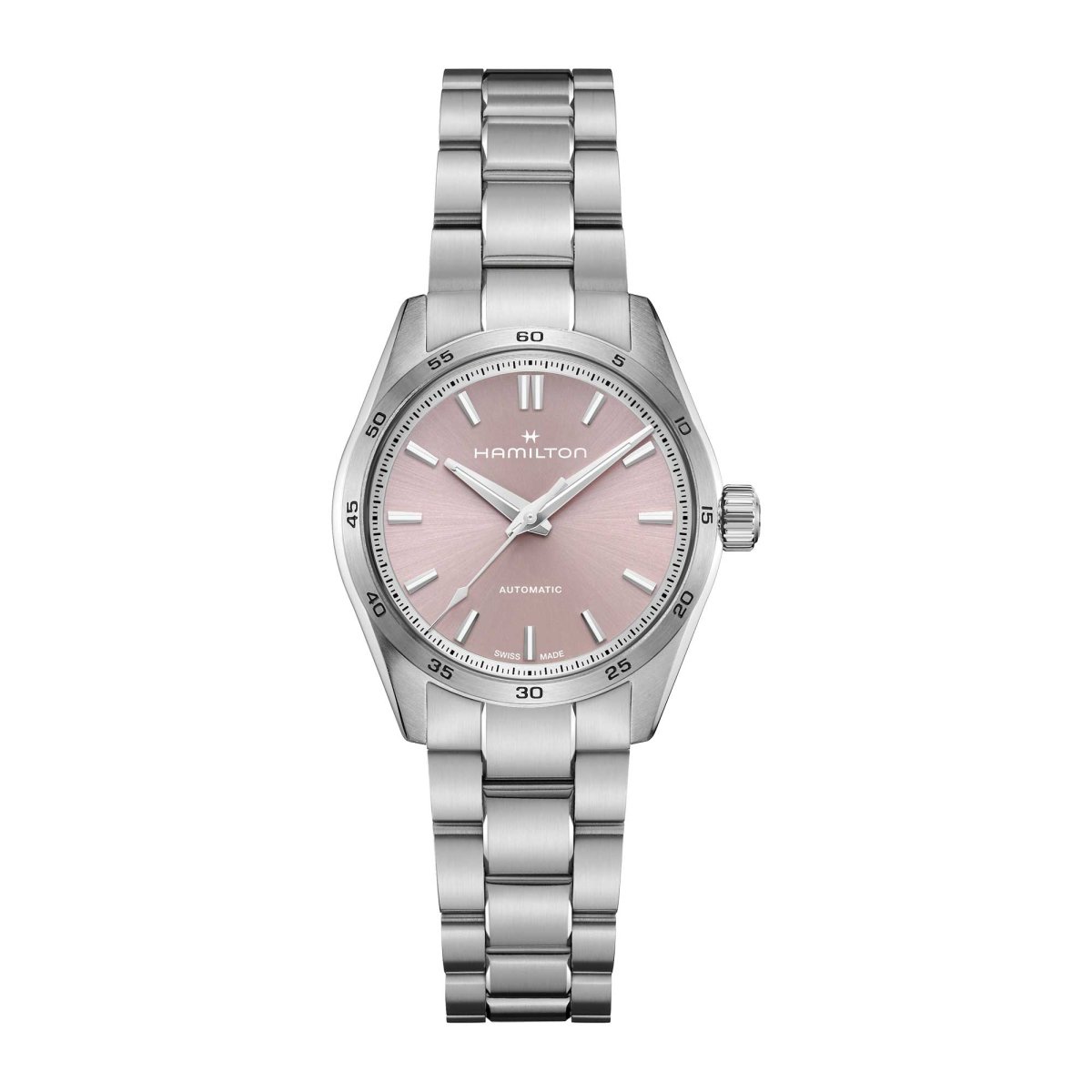 Pensata per chi ama in egual misura funzionalità e stile, la linea Jazzmaster Performer offre una potente estetica sporty-chic. Animato dal movimento automatico H-10 con riserva di carica fino a 80 ore, questo Jazzmaster Performer Automatic presenta una cassa in acciaio da 34 mm messa in risalto da un delicato quadrante colorato di rosa, indici in nichel e un raffinato bracciale in acciaio.