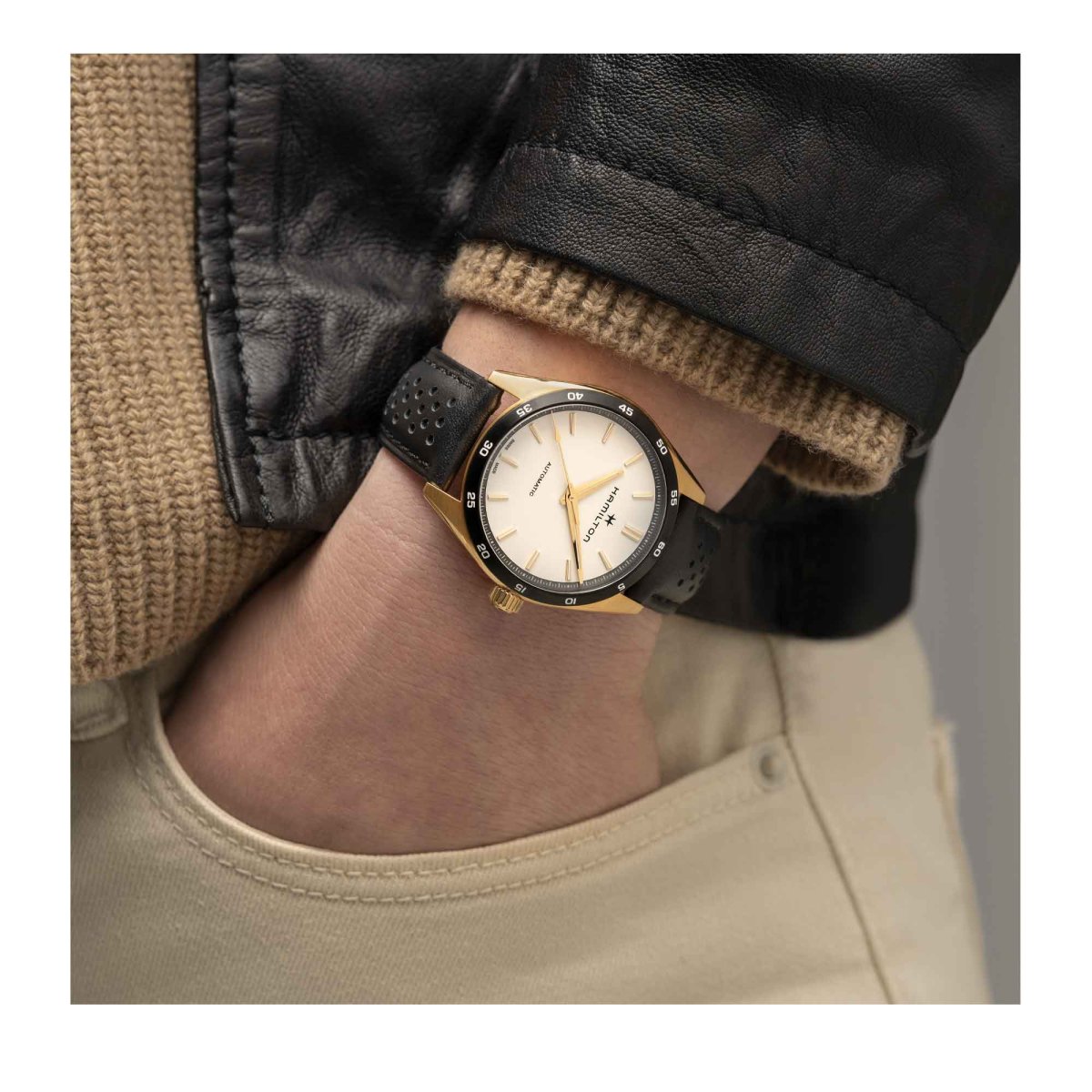 Pensata per chi ama l’equilibrio tra stile e funzionalità, la linea Jazzmaster Performer offre un look sporty-chic accattivante. Animato dal movimento automatico H-10 con riserva di carica fino a 80 ore, questo Jazzmaster Performer Automatic presenta una cassa in acciaio da 38 mm con rivestimento in PVD oro rosa, messa in risalto da un sobrio quadrante bianco e un cinturino in pelle nera traforata abbinato alla lunetta e ispirato alle corse automobilistiche.