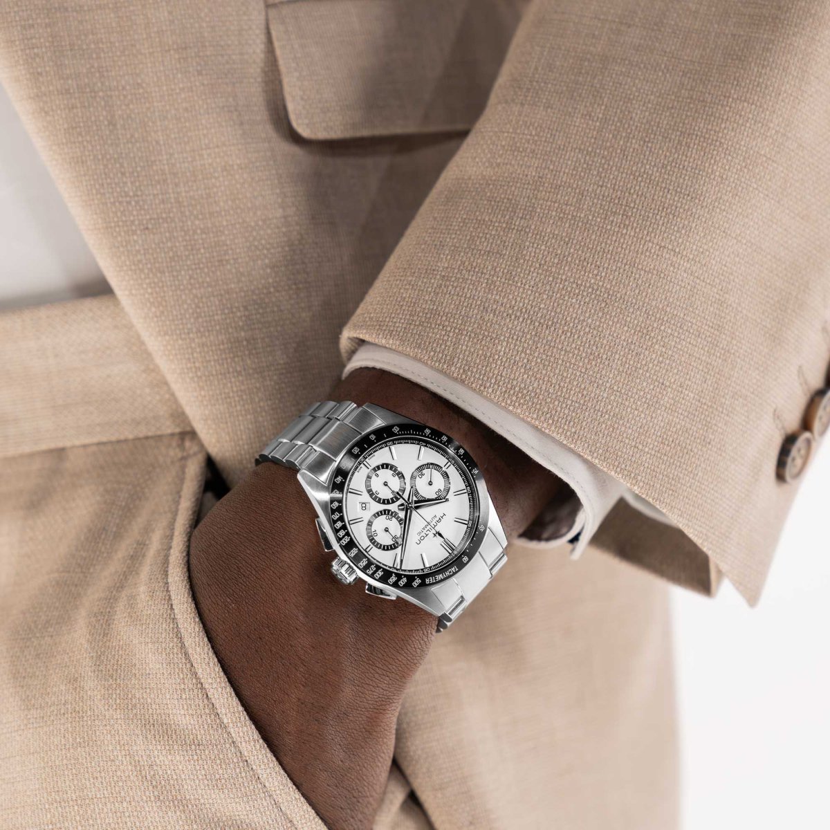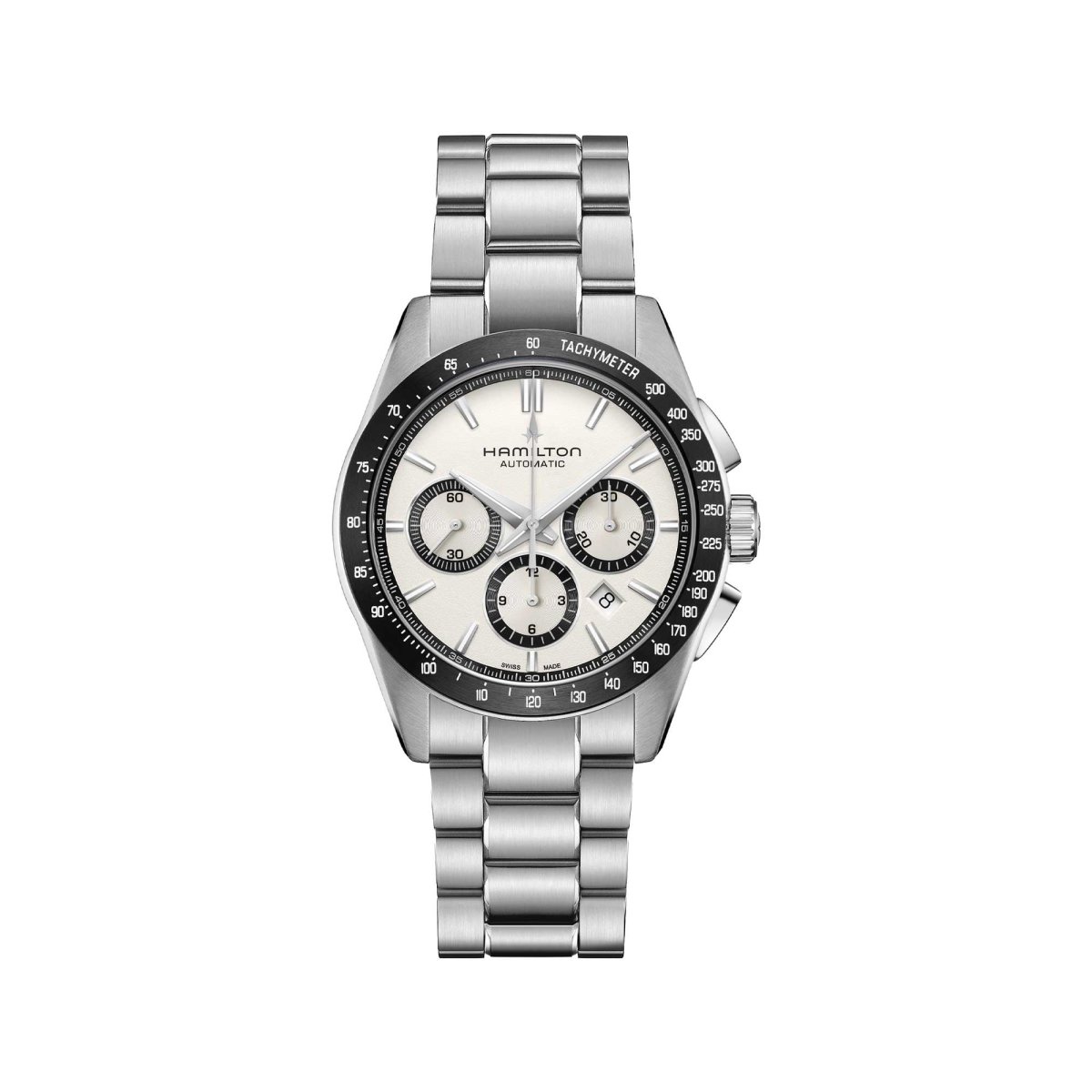 Animato dal movimento cronografo automatico H-31 con riserva di carica da 60 ore, il Jazzmaster Performer Automatic Chronograph presenta una cassa in acciaio da 42 mm messa in risalto da un quadrante bianco classico con lunetta nera a contrasto e da un bracciale in acciaio dallo stile deciso.