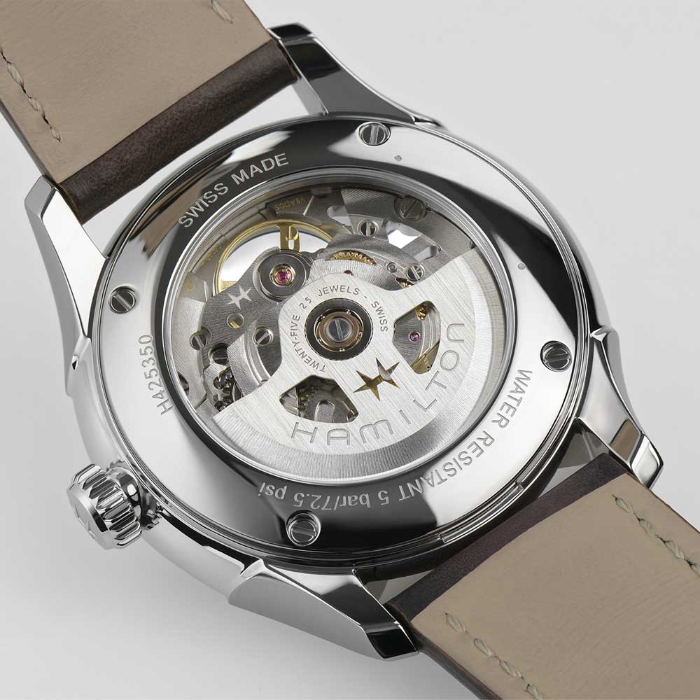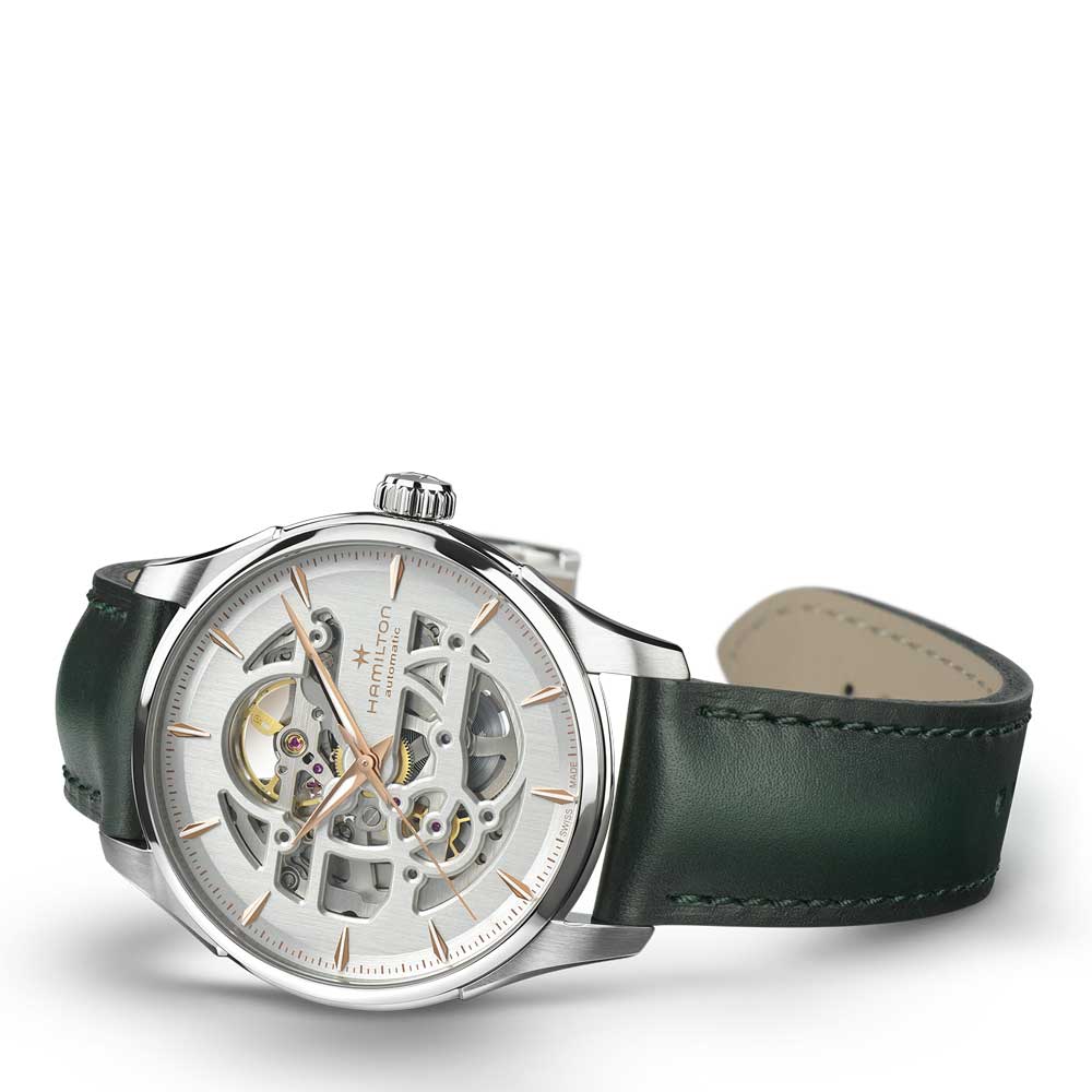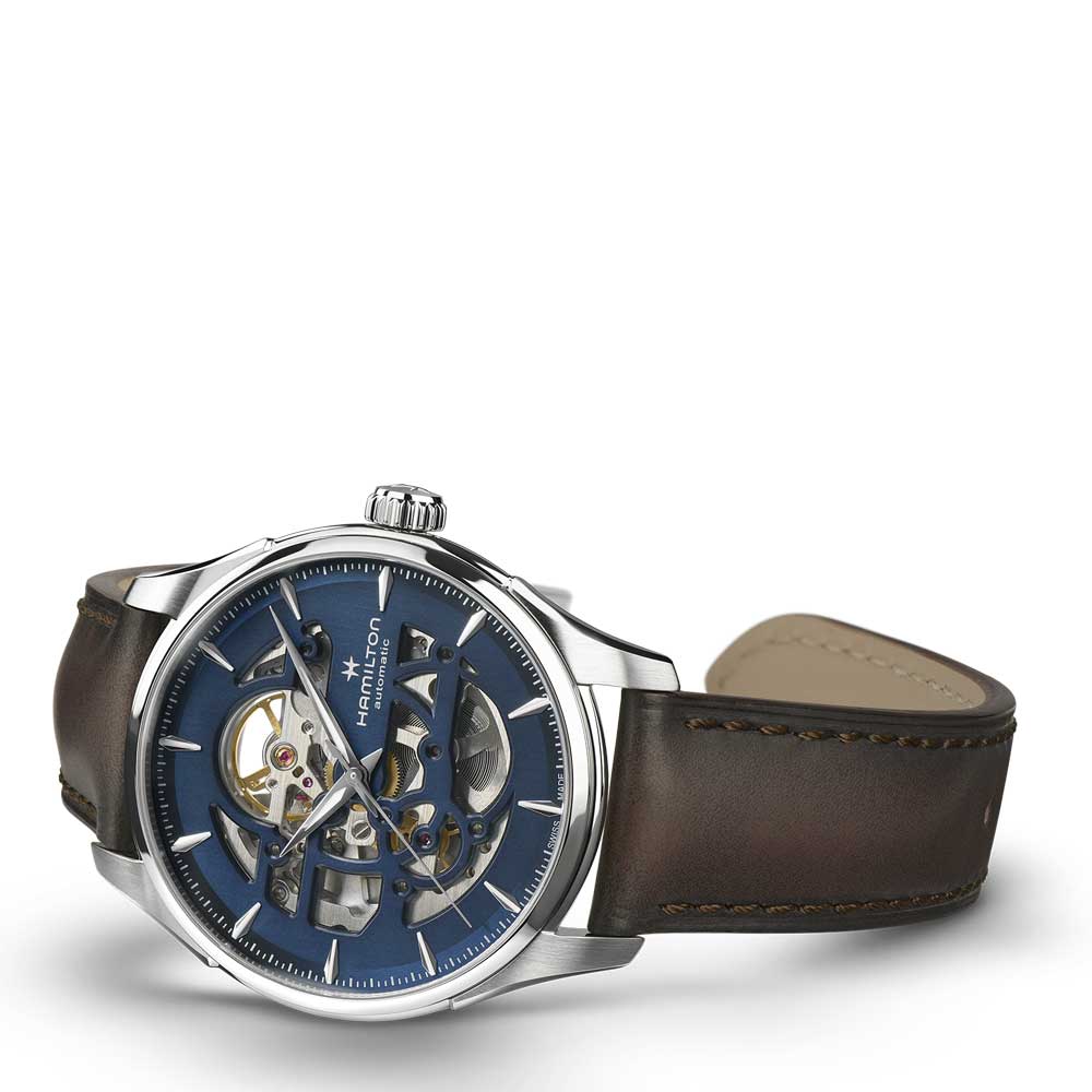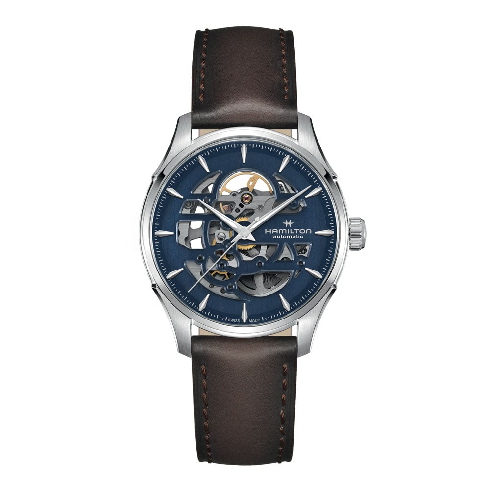 Il Jazzmaster Skeleton 36 mm, con il suo quadrante traforato blu, punta tutto sulla precisione e rivela al contempo la raffinata bellezza del movimento meccanico al suo interno. Mettendo in risalto il movimento automatico H-10, con una riserva di carica di 80 ore e spirale in Nivachron™, il Jazzmaster Skeleton vanta un sofisticato cinturino in pelle marrone, che incarna il savoir-faire in continua evoluzione di Hamilton e l’attenzione ai dettagli.