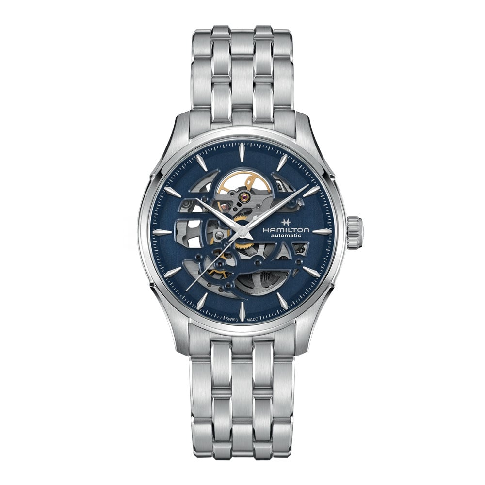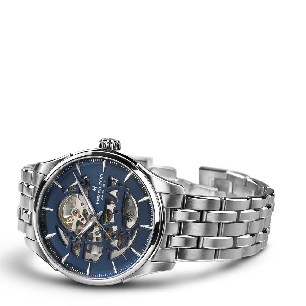Il Jazzmaster Skeleton 40 mm, con il suo quadrante traforato blu, punta tutto sulla precisione e rivela al contempo la raffinata bellezza del movimento meccanico al suo interno. Mettendo in risalto il movimento automatico H-10, con una riserva di carica di 80 ore e spirale in Nivachron™, il Jazzmaster Skeleton vanta un sofisticato bracciale in acciaio, che incarna il savoir-faire in continua evoluzione di Hamilton e l’attenzione ai dettagli.