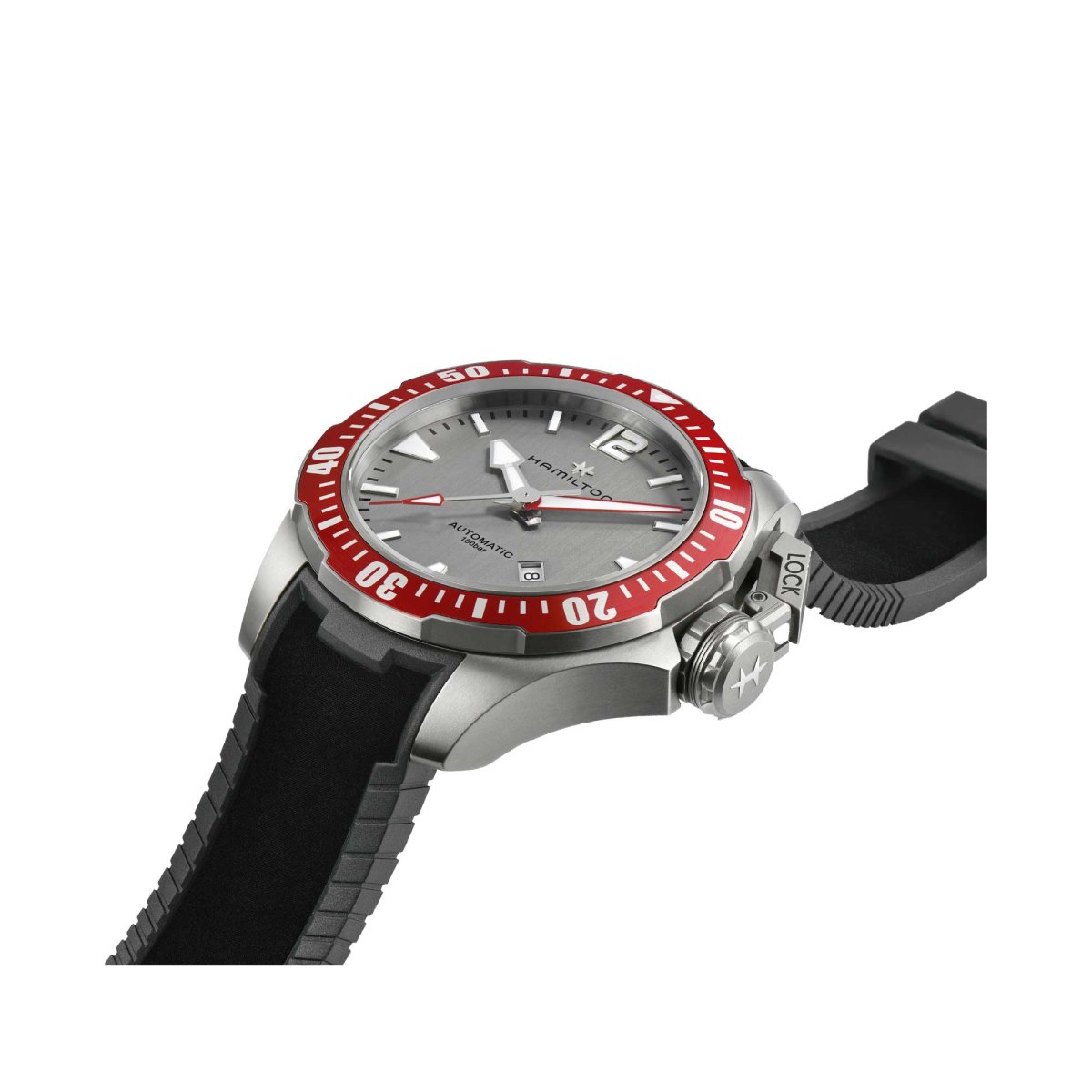 Con la sua robusta cassa da 46 mm, il Khaki Navy Frogman Titanium è un vero gigante del mare. Impermeabile fino a 100 bar (1.000 m), è adatto alle profondità e agli ambienti sottomarini più ostili. Realizzato in titanio leggero ma resistente e corredato da un pratico cinturino in caucciù, è un dispositivo di sicurezza fondamentale per gli esploratori subacquei.