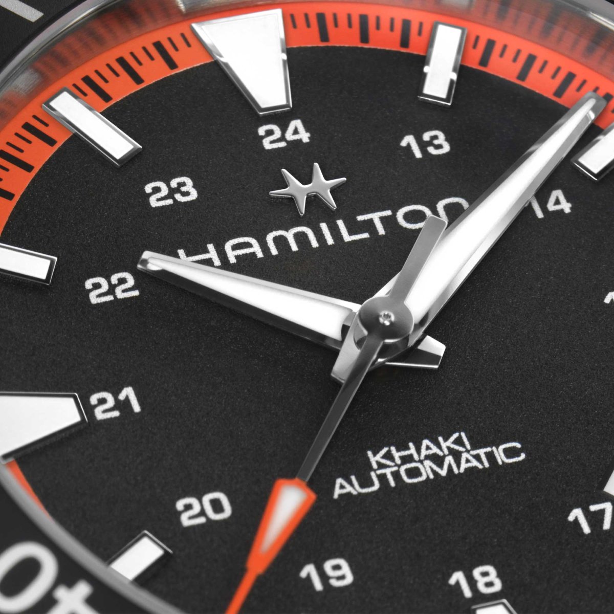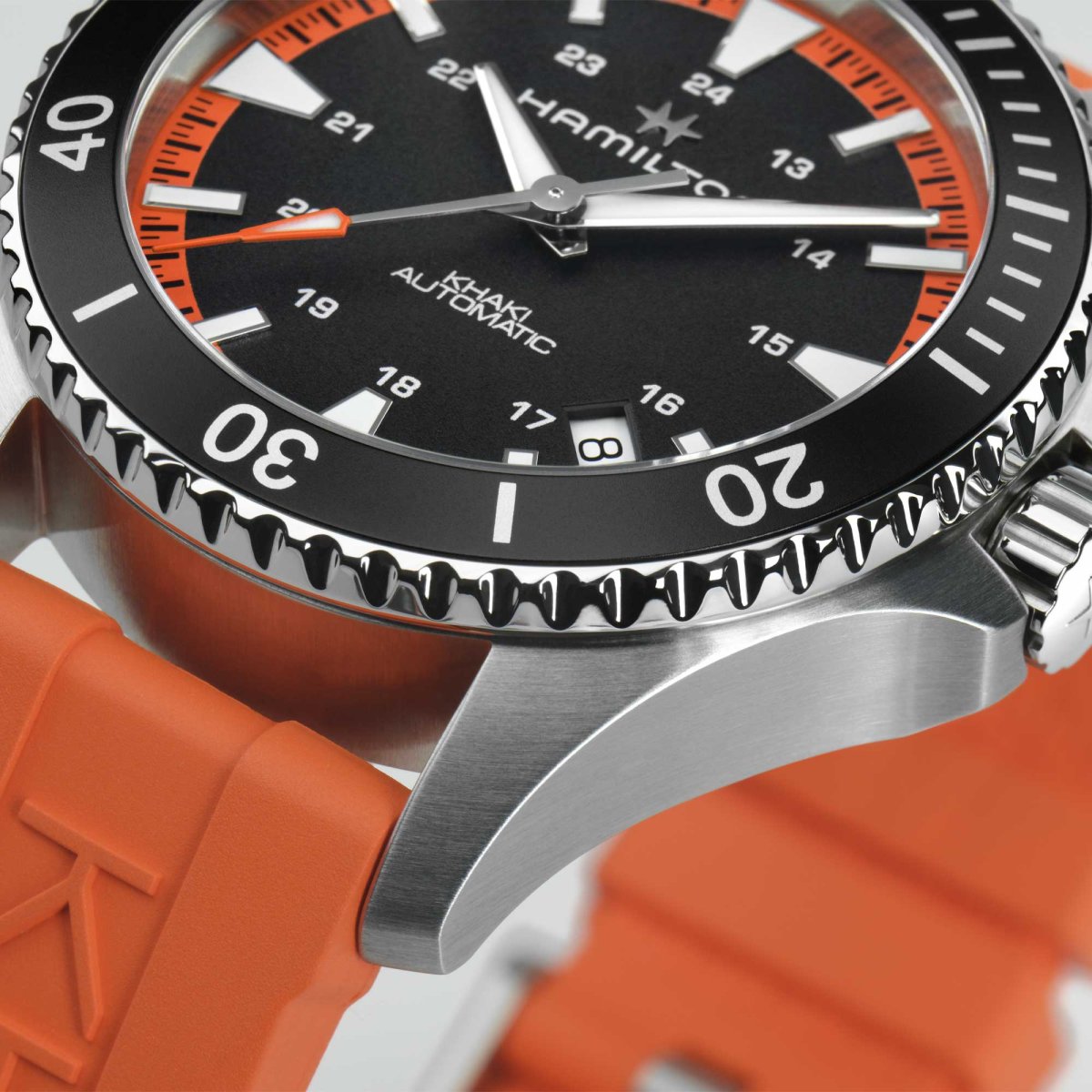 Sulla spiaggia, a bordo piscina o nelle profondità marine, lo stile del nuovo Khaki Navy Scuba fa sempre colpo. Pensato per i marinai moderni, i surfisti, gli amanti dello snorkeling o della spiaggia, è accattivante e funzionale grazie al cinturino in caucciù arancione e al quadrante nero a contrasto. Il tuo compagno ideale per cronometrare una nuotata, una corsa o per un momento di relax al sole.