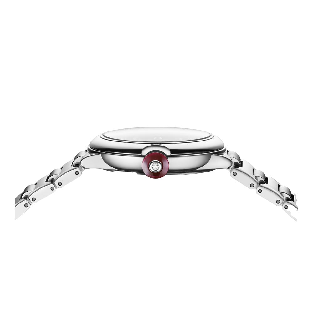 Orologio Lvcea con movimento a carica automatica, funzioni ore, minuti e secondi, cassa di 33 mm in acciaio inossidabile lucido, quadrante intarsiato in madreperla verde, indici con 12 diamanti tondi taglio brillante, corona in acciaio inossidabile con zaffiro rosa sintetico taglio cabochon e diamante, bracciale con fibbia déployante in acciaio inossidabile lucido e satinato-spazzolato. Impermeabile fino a 50 metri.