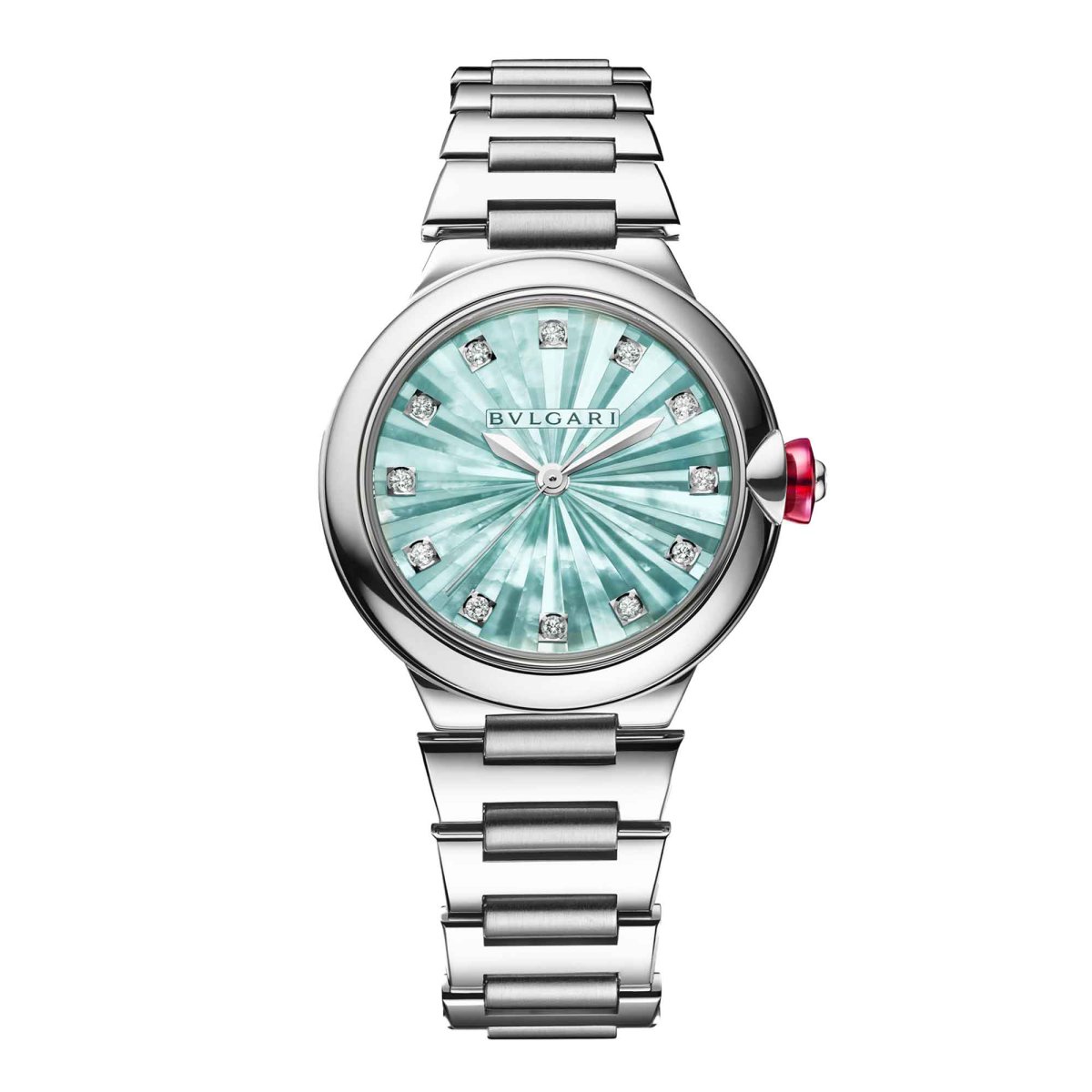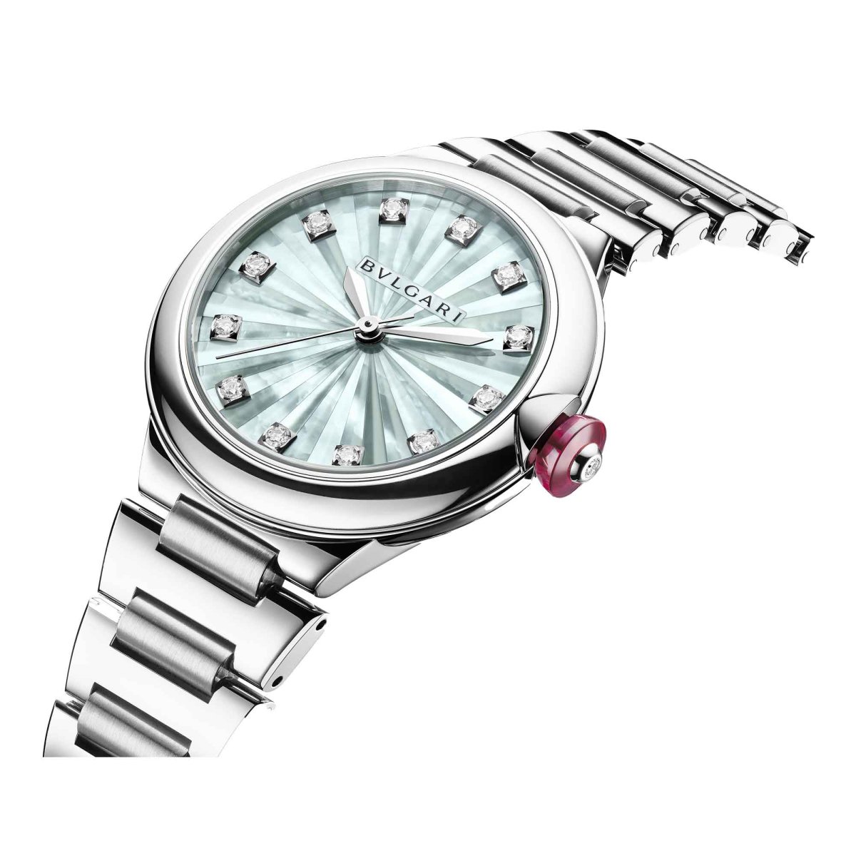 Simbolo di una femminilità moderna e radiosa, l’orologio Lvcea dona un tocco di glamour allo stile di ogni giorno. Infuso di eccezionale maestria artigianale, quest’orologio in acciaio inossidabile lucido e satinato-spazzolato è un emblema dell’eccellenza di Bvlgari nell’arte della gioielleria e dell’orologeria. Adornato da indici con diamanti, il quadrante tridimensionale si compone di elementi in madreperla verde, singolarmente sfaccettati ed assemblati per evocare i raggi del sole. Una classica tecnica Métiers d’Art ispirata all’antica lavorazione ad intarsio.