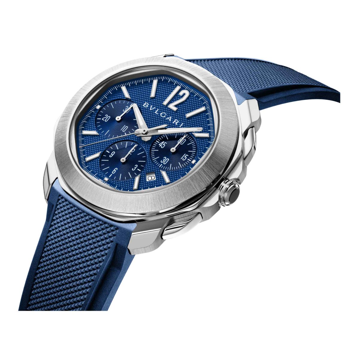 Orologio Octo Roma Chronograph con movimento meccanico di manifattura a carica automatica, ore, minuti, secondi centrali, data, funzioni cronografo, calibro BVL399 e riserva di carica di 42 ore. Cassa di 42 mm in acciaio inossidabile lucido e satinato-spazzolato, quadrante blu con finiture Clous de Paris, lancette e indici metallici in Super-LumiNova®, finestrella della data a ore 4.3, piccoli secondi a ore 3, cronografo ora a ore 6 e cronografo minuti a ore 9, corona a vite con sistema protettivo in acciaio inossidabile e bracciale intercambiabile in acciaio inossidabile lucido e satinato-spazzolato. Impermeabile fino a 100 metri.