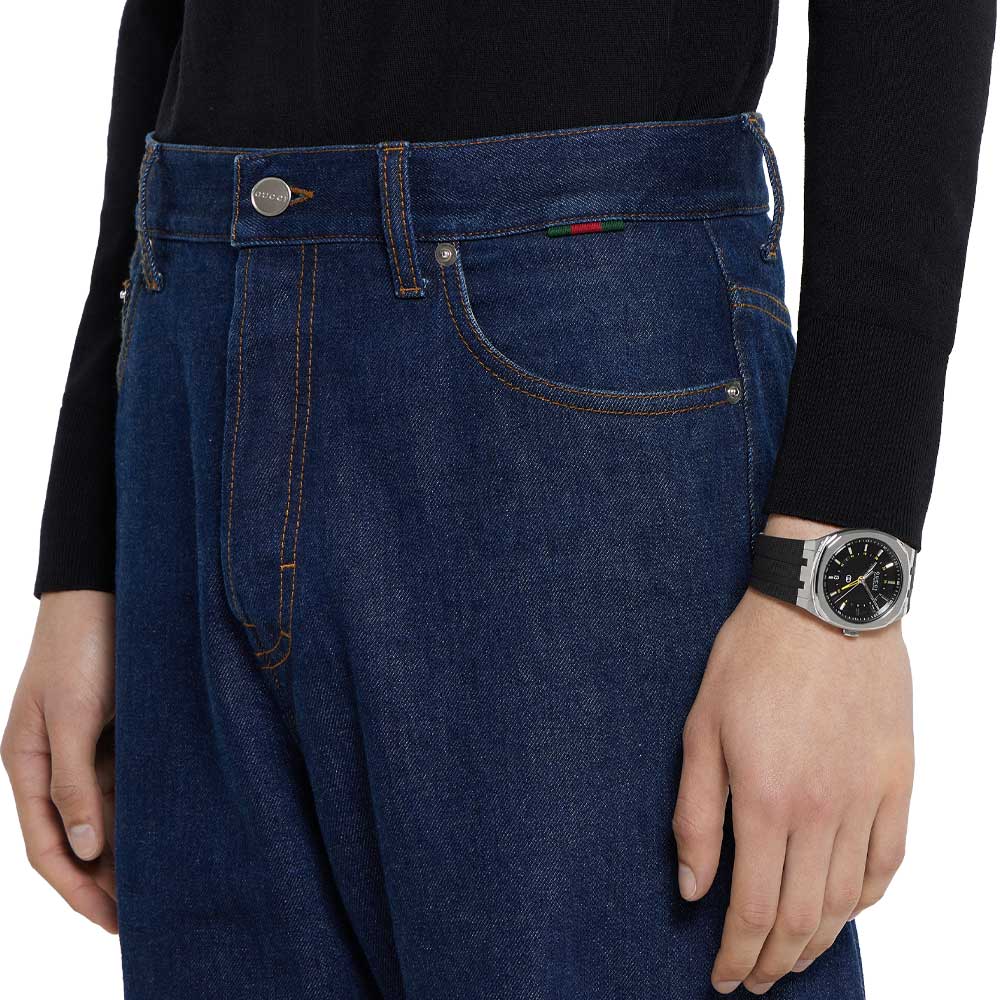 Per le ultime collezioni, la linea è rivisitata in una palette cromatica dalle tonalità raffinate che mettono in risalto i motivi emblematici della Maison. Questo orologio presenta un cinturino intercambiabile in gomma e un quadrante nero, impreziosito dalla scritta Gucci e dall’Incrocio GG.