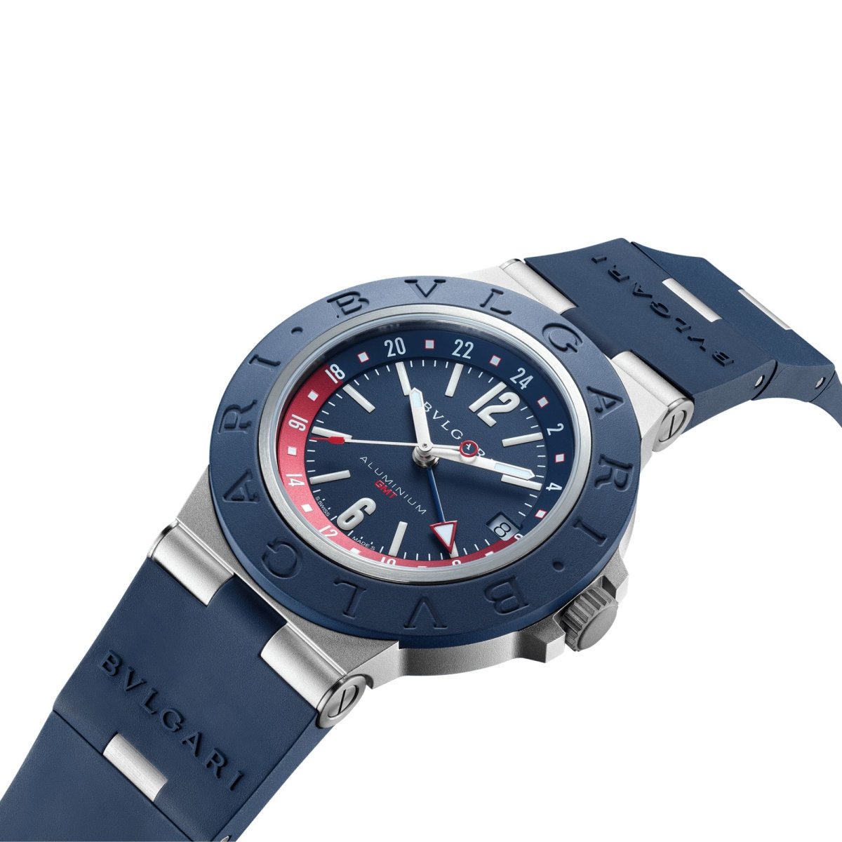 Orologio BVLGARI Aluminium GMT con movimento meccanico a carica automatica, ore, minuti, secondi, data e funzione GMT 24h, calibro B192, cassa di 40 mm in alluminio, lunetta in caucciù blu con doppio logo, quadrante blu con indici e lancette SLN, finestrella della data, fondello in titanio, anse in alluminio e cinturino in caucciù blu con fibbia ad ardiglione in alluminio. Impermeabile fino a 100 metri.