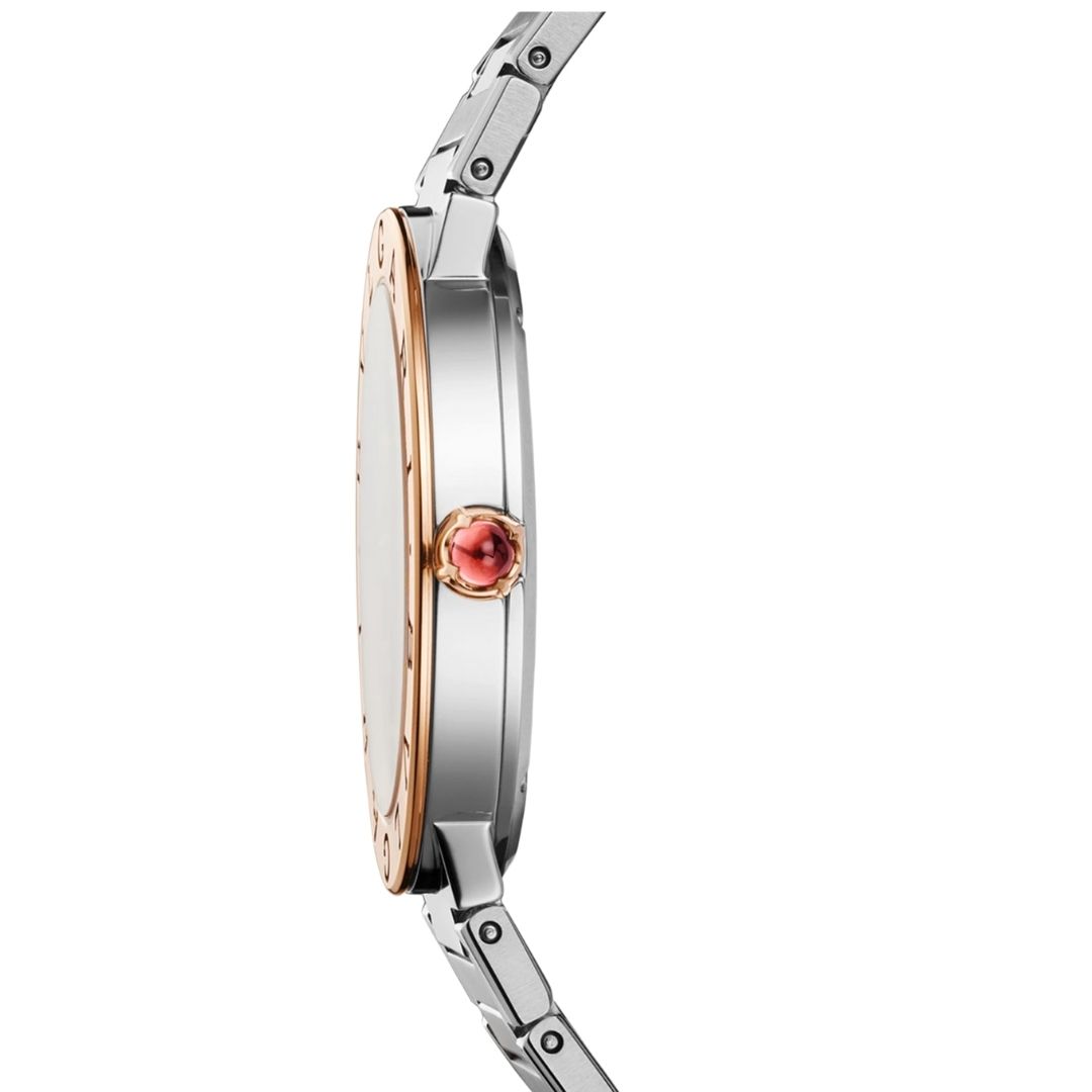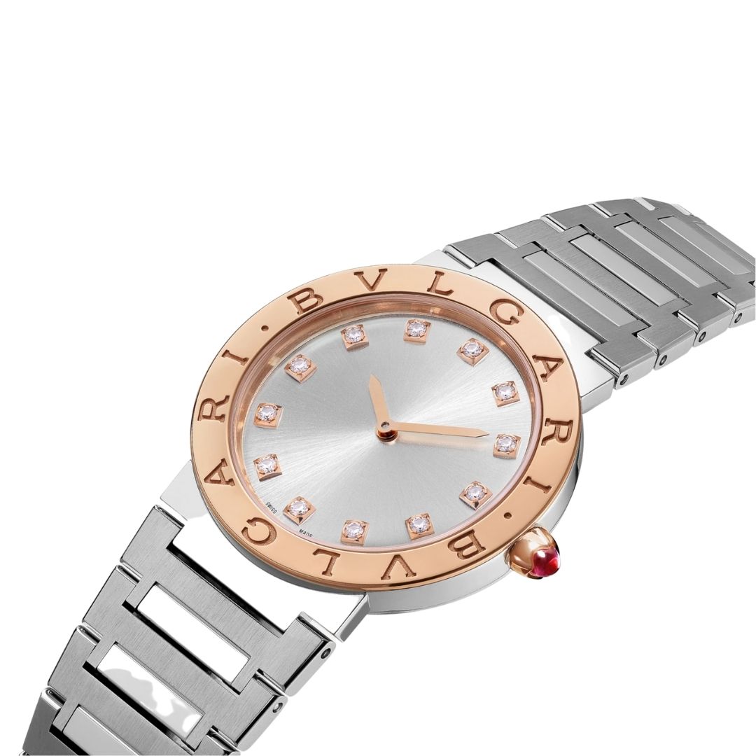 Lanciato per la prima volta nel 1977, l’orologio Bvlgari Bulgari Lady in acciaio inossidabile e oro rosa 18 kt incarna pienamente più di quarant’anni di stile e audace creatività. Ispirato alle iscrizioni riportate lungo il bordo delle antiche monete romane, l’iconico doppio logo inciso sulla lunetta a contorno del quadrante argentato soleil è simbolo dell’impareggiabile maestria di Bulgari nell’unire tradizione e modernità in creazioni dal fascino senza tempo, capaci di andare oltre ogni epoca e tendenza. Gli indici con diamanti taglio brillante danno al modello un tocco di preziosa eleganza.