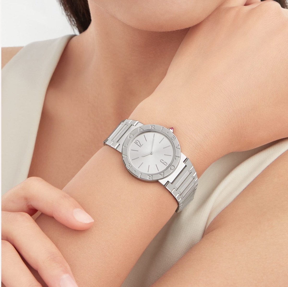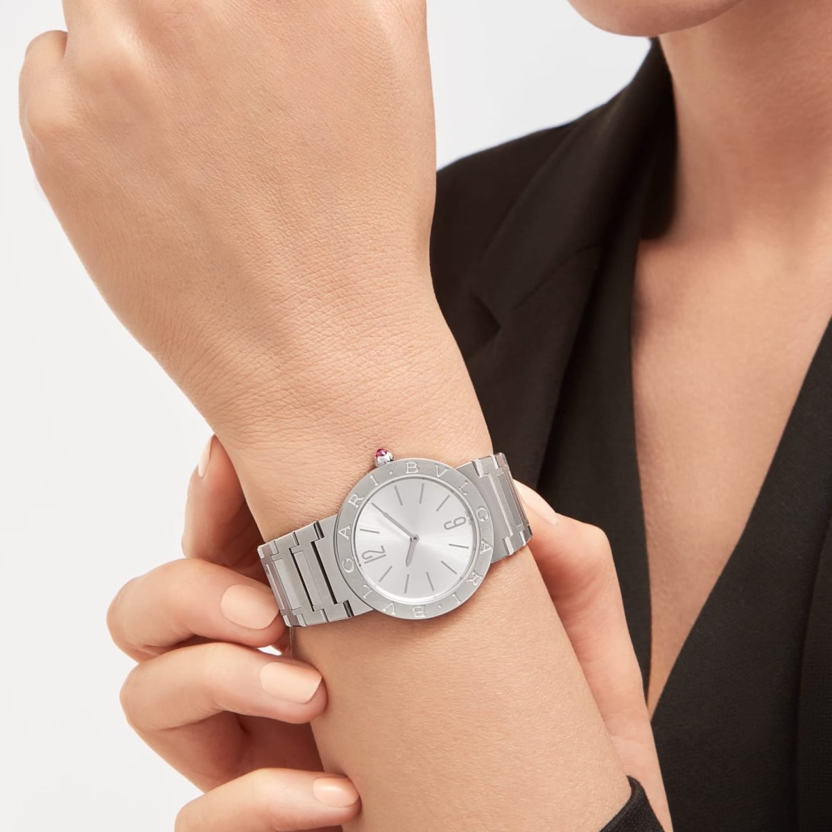Orologio bvlgari bvlgari lady con movimento al quarzo, cassa di 33 mm in acciaio inossidabile, lunetta in acciaio inossidabile con doppio logo, quadrante argentato soleil, corona in acciaio inossidabile con rubellite rosa taglio cabochon e bracciale in acciaio inossidabile. Impermeabile fino a 30 metri.