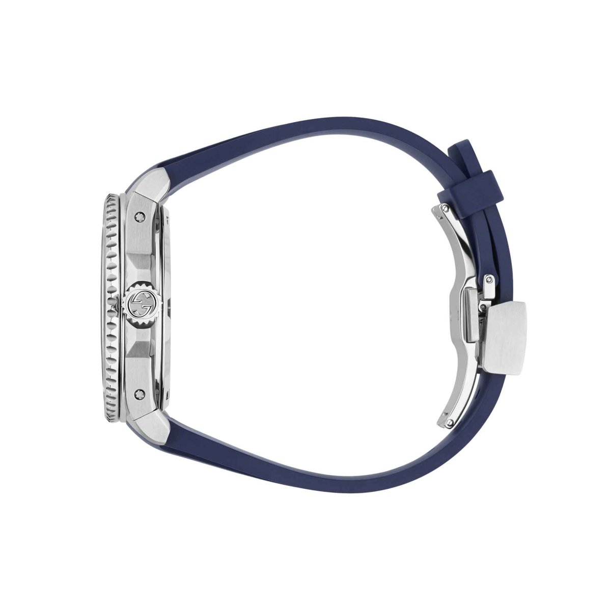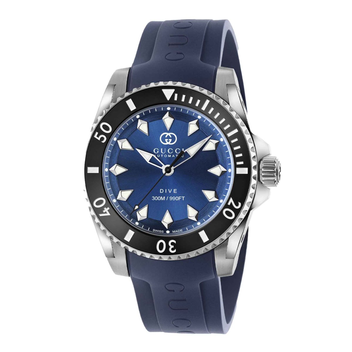 La linea Gucci Dive continua a reinterpretare i codici della Maison in modi contemporanei. Caratterizzato da una cassa in acciaio e un cinturino in gomma, questo orologio presenta un quadrante blu con l’emblematico logo Incrocio GG.