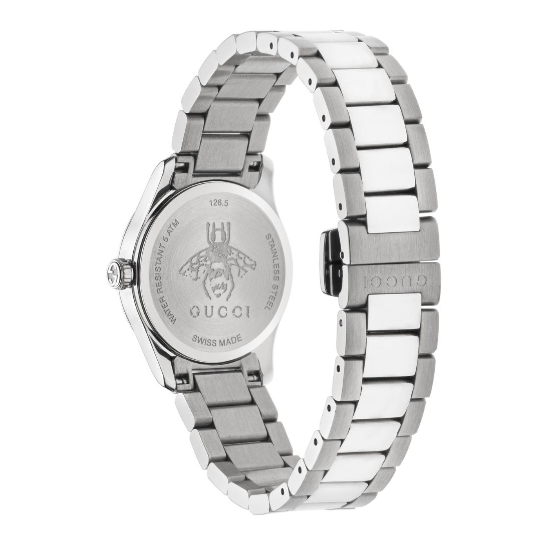 Composto da cassa e cinturino in acciaio, questo orologio con quadrante in madreperla rosa entra a far parte della linea G-Timeless nella collezione Cruise 2020. Al centro del quadrante è raffigurato il Mystic Cat, un codice storico della Maison, qui circondato da altri simboli Gucci come la stella, l’ape e il logo GG, che fungono da indici.