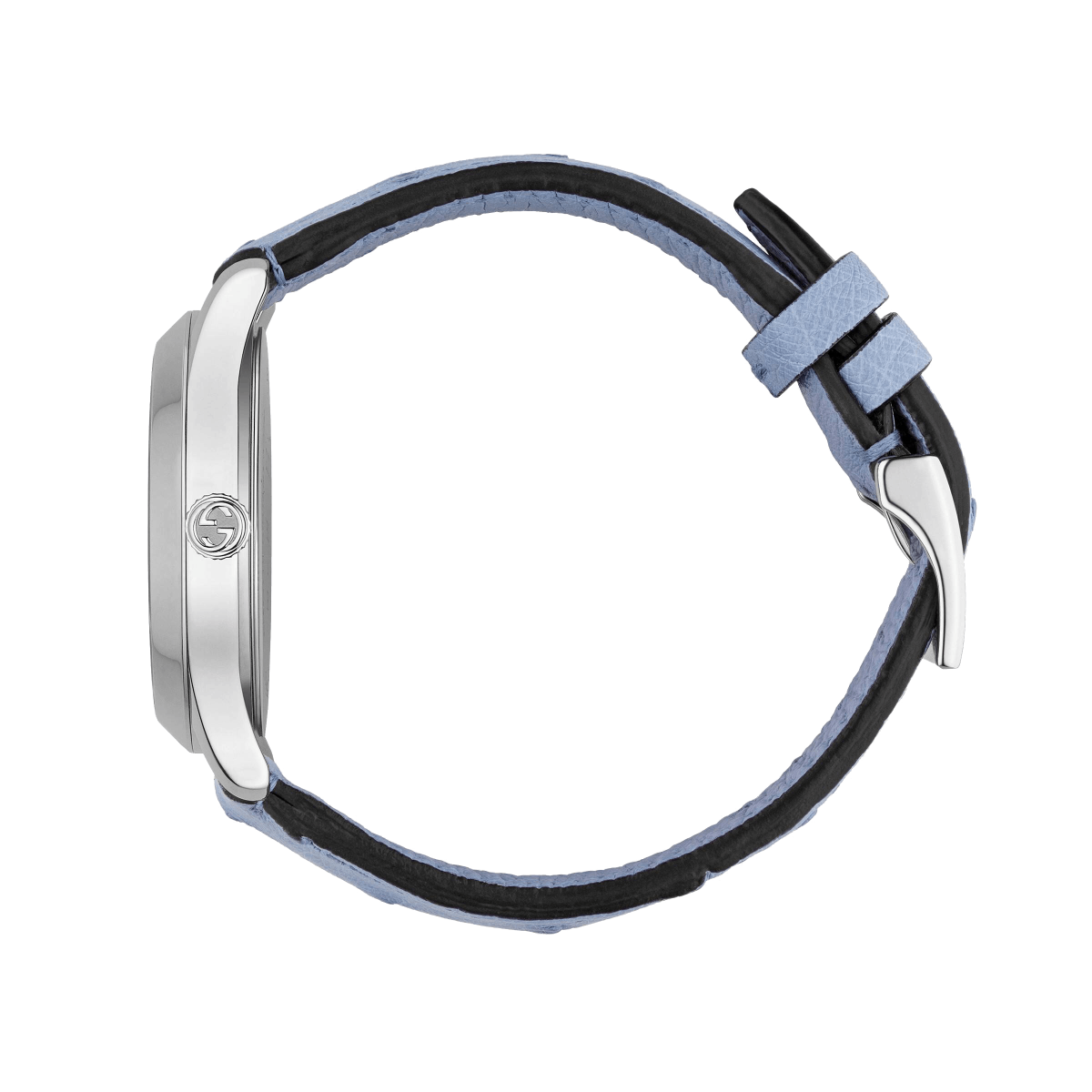 Parte della nota collezione l’Orologio Gucci G – Timeless automatico ha un quadrante in madreperla trasparente, che consente una visione del movimento dell’orologio, arricchito da un Kingsnake in argento. Un cinturino in pelle di struzzo intercambiabile completa lo stile.