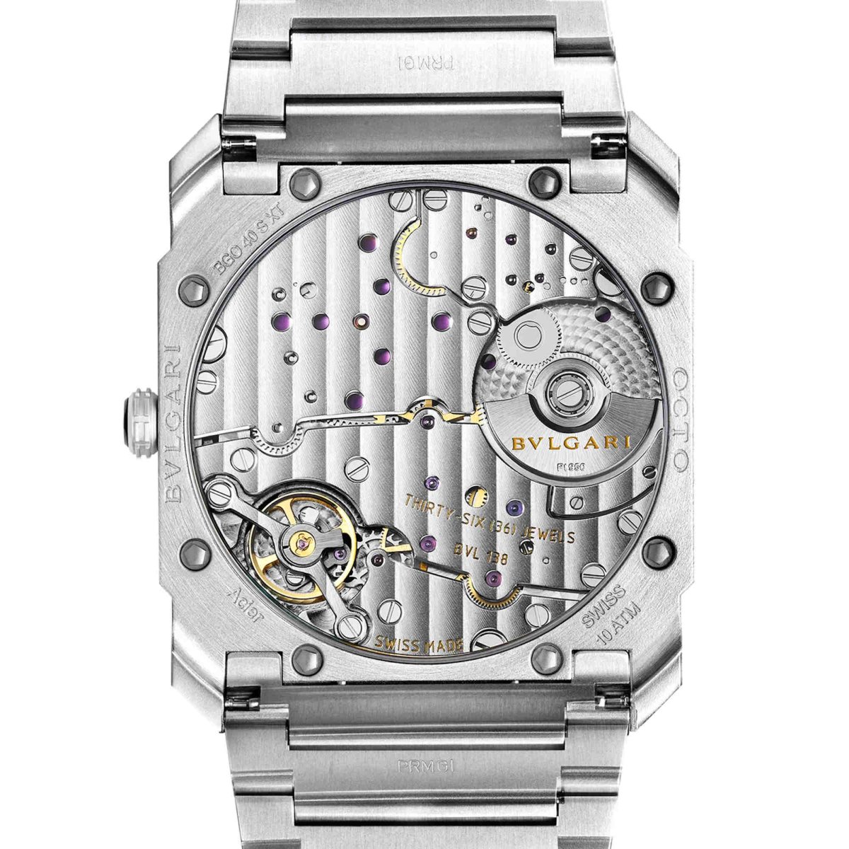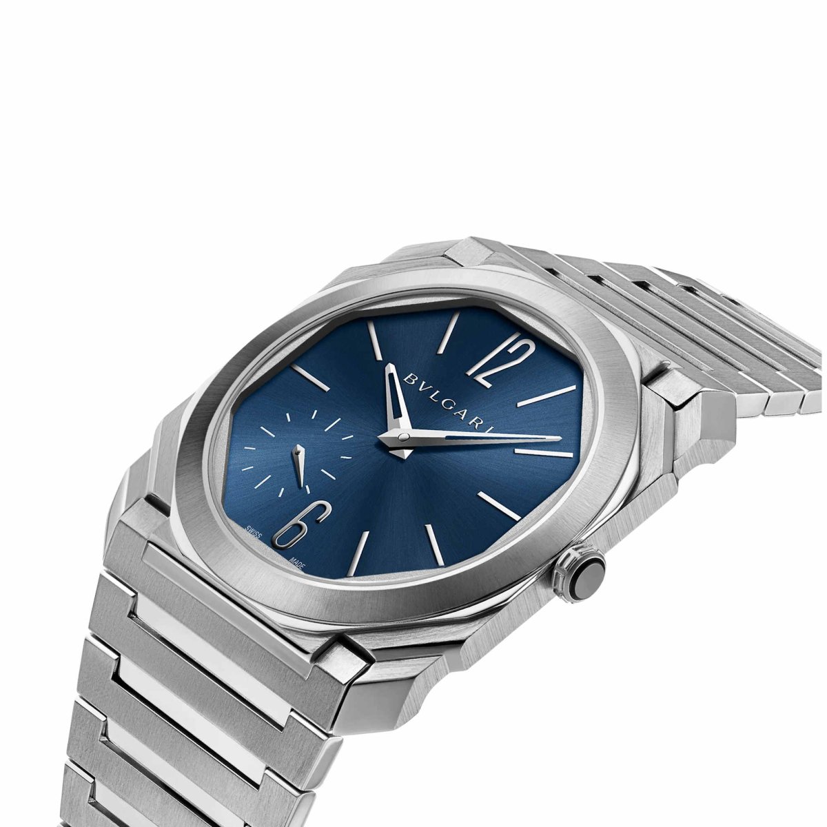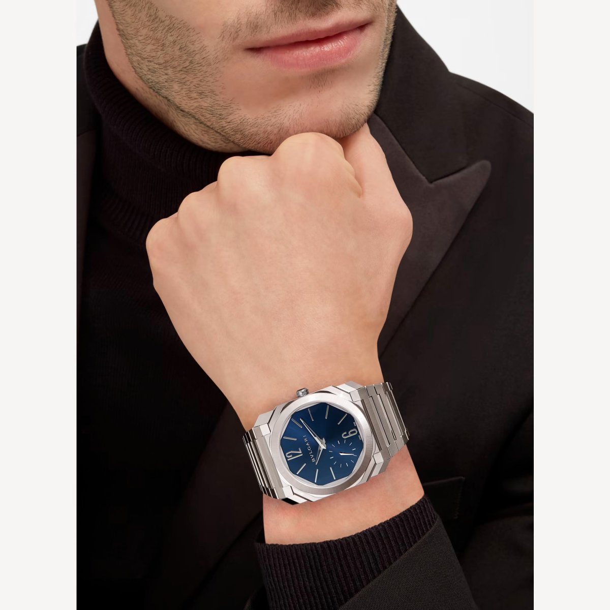 Orologio Octo Finissimo Automatique con movimento meccanico di manifattura a carica automatica, microrotore in platino e piccoli secondi. Calibro BVL 138, cassa ultrapiatta di 40 mm in acciaio inossidabile lucido-satinato (spessore 6,40 mm), fondello a vista, corona a vite in acciaio inossidabile lucido con inserto in ceramica, quadrante laccato blu con finiture soleil, bracciale integrato in acciaio inossidabile lucido-satinato con fibbia déployante. Impermeabile fino a 100 metri.