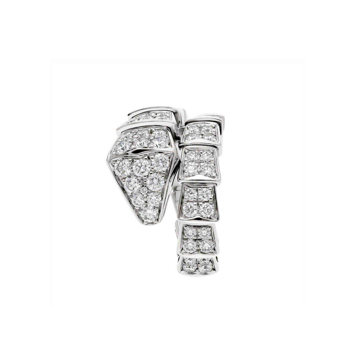 Anello Serpenti Viper in oro bianco 18 kt con pavé di diamanti. Catturando il potere seduttivo del serpente, Bulgari dà vita a una creazione dal design ipnotico e accattivante. Un anello dalle linee sinuose che si avvolge al dito con le sue preziose spire, risplendendo in tutta la sua sofisticata eleganza. Anello Serpenti Viper in oro bianco 18 kt con pavé di diamanti.